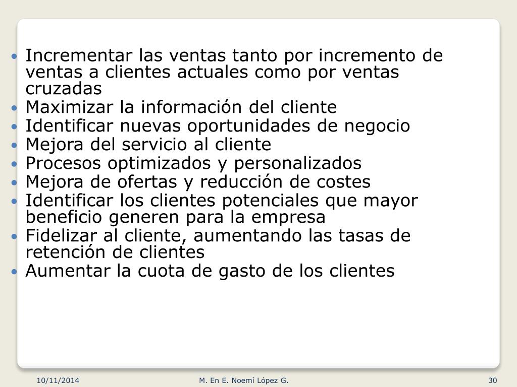 Incrementar las ventas tanto por incremento de ventas a clientes actuales como por ventas cruzadas Maximizar la información del cliente Identificar nuevas oportunidades de negocio Mejora del servicio al cliente Procesos optimizados y personalizados Mejora de ofertas y reducción de costes Identificar los clientes potenciales que mayor beneficio generen para la empresa Fidelizar al cliente, aumentando las tasas de retención de clientes Aumentar la cuota de gasto de los clientes M. En E. Noemí López G.