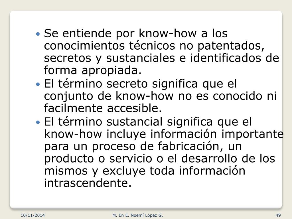 Se entiende por know-how a los conocimientos técnicos no patentados, secretos y sustanciales e identificados de forma apropiada. El término secreto significa que el conjunto de know-how no es conocido ni facilmente accesible. El término sustancial significa que el know-how incluye información importante para un proceso de fabricación, un producto o servicio o el desarrollo de los mismos y excluye toda información intrascendente. M. En E. Noemí López G.