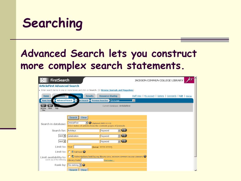 …is a Web-based information system for searching online databases. A database is a collection of related resources on a specific topic. Each entry in a database is called a record. FirstSearch