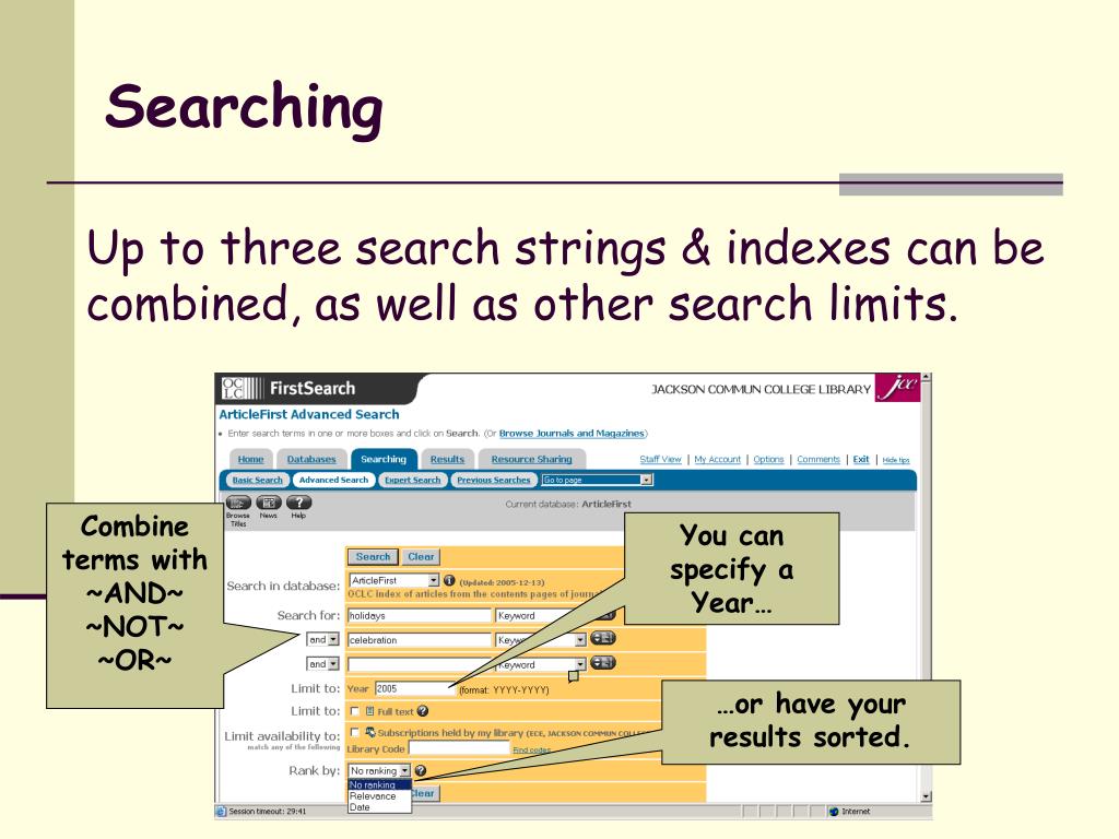 Up to three search strings & indexes can be combined, as well as other search limits. Searching Combine terms with ~AND~ ~NOT~ ~OR~ You can specify a Year… …or have your results sorted.