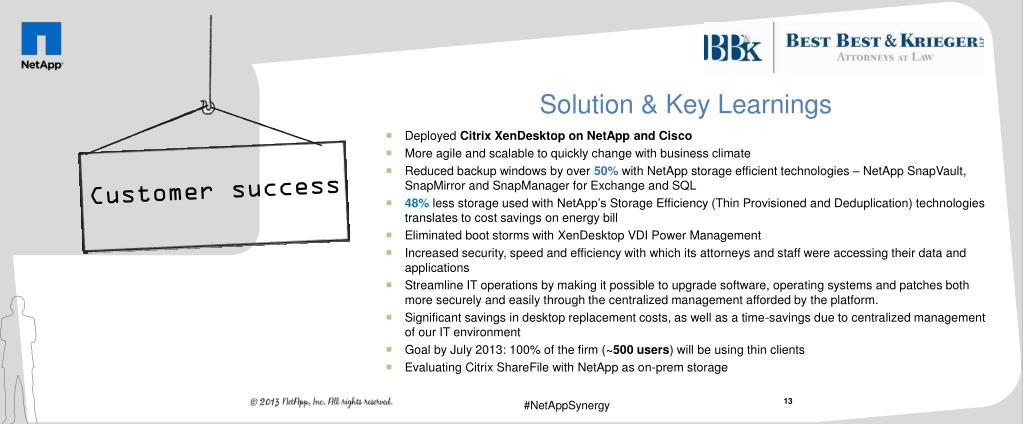 Solution & Key Learnings • Deployed Citrix XenDesktop on NetApp and Cisco • More agile and scalable to quickly change with business climate • Reduced backup windows by over 50% with NetApp storage efficient technologies – NetApp SnapVault,SnapMirrorand SnapManager for Exchange and SQL • 48% less storage used with NetApp’s Storage Efficiency (Thin Provisioned and Deduplication) technologies translates to cost savings on energy bill • Eliminated boot storms with XenDesktop VDI Power Management • Increased security, speed and efficiency with which its attorneys and staff were accessing their data and applications • Streamline IT operations by making it possible to upgrade software, operating systems and patches both more securely and easily through the centralized management afforded by the platform. • Significant savings in desktop replacement costs, as well as a time-savings due to centralized management of our IT environment • Goal by July 2013: 100% of the firm (~500 users) will be using thin clients • Evaluating Citrix ShareFile with NetApp as on-prem storage Customersuccess #NetAppSynergy