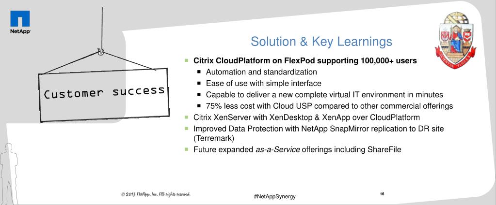 Solution & Key Learnings • Citrix CloudPlatform on FlexPod supporting 100,000+ users • Automation and standardization • Ease of use with simple interface • Capable to deliver a new complete virtual IT environment in minutes • 75% less cost with Cloud USP compared to other commercial offerings • Citrix XenServer with XenDesktop& XenApp over CloudPlatform • Improved Data Protection with NetApp SnapMirror replication to DR site (Terremark) • Future expanded as-a-Service offerings including ShareFile Customersuccess #NetAppSynergy