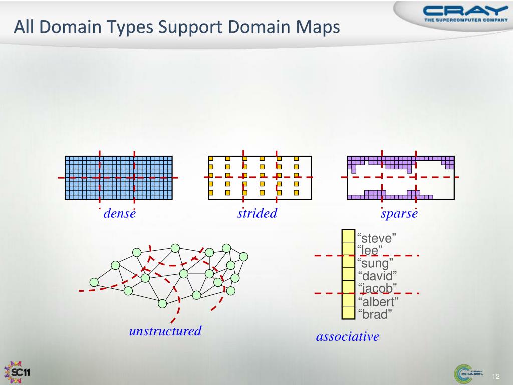 All Domain Types Support Domain Maps dense strided sparse “steve” “lee” “sung” “david” “jacob” “albert” “brad” unstructured associative