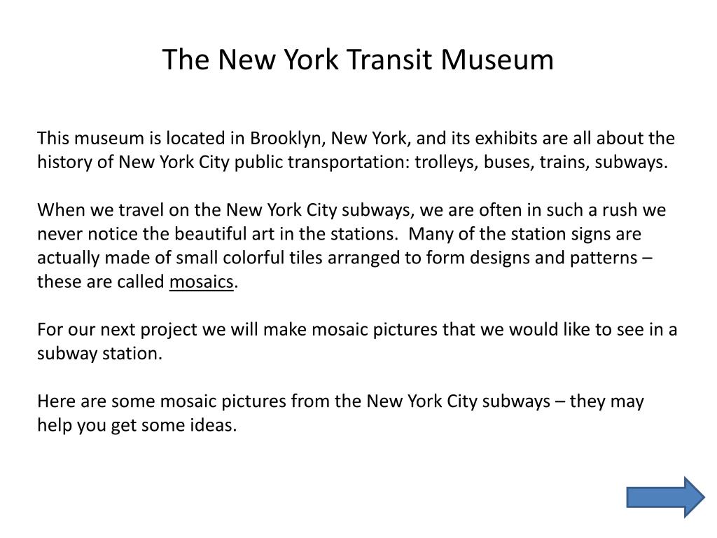 The New York Transit Museum This museum is located in Brooklyn, New York, and its exhibits are all about the history of New York City public transportation: trolleys, buses, trains, subways. When we travel on the New York City subways, we are often in such a rush we never notice the beautiful art in the stations. Many of the station signs are actually made of small colorful tiles arranged to form designs and patterns – these are called mosaics. For our next project we will make mosaic pictures that we would like to see in a subway station. Here are some mosaic pictures from the New York City subways – they may help you get some ideas.