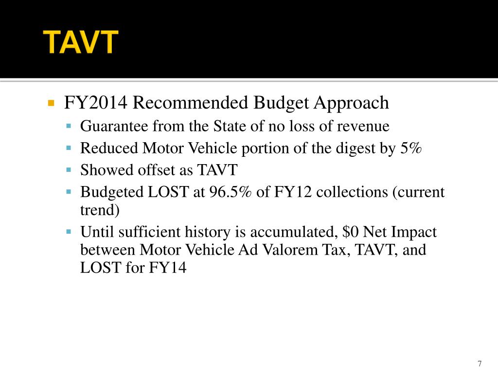 MAY 14, 2013. TITLE AD VALOREM TAX (TAVT). TAVT. Established by House Bill 386 Effective March 1, 2013 Replaces the annual Ad Valorem “Birthday Tax”. TAVT. What happened on March 1, 2013? What changed when motor vehicles titled on or after March 1, 2013? Exempt from sales and use tax