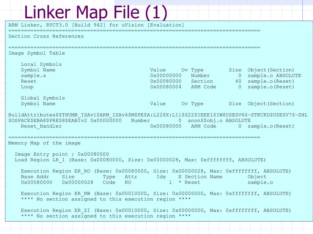 Linker Map File (1) ARM Linker, RVCT3.0 [Build 942] for uVision [Evaluation] ================================================================================ Section Cross References ================================================================================ Image Symbol Table Local Symbols Symbol Name Value Ov Type Size Object(Section) sample.s 0x00000000 Number 0 sample.o ABSOLUTE Reset 0x00080000 Section 40 sample.o(Reset) Loop 0x00080004 ARM Code 0 sample.o(Reset) Global Symbols Symbol Name Value Ov Type Size Object(Section) BuildAttributes$$THUMB_ISAv1$ARM_ISAv4$M$PE$A:L22$X:L11$S22$IEEE1$IW$USESV6$~STKCKD$USESV7$~SHL$OSPACE$EBA8$PRES8$EABIv2 0x00000000 Number 0 anon$$obj.o ABSOLUTE Reset_Handler 0x00080000 ARM Code 0 sample.o(Reset) ================================================================================ Memory Map of the image Image Entry point : 0x00080000 Load Region LR_1 (Base: 0x00080000, Size: 0x00000028, Max: 0xffffffff, ABSOLUTE) Execution Region ER_RO (Base: 0x00080000, Size: 0x00000028, Max: 0xffffffff, ABSOLUTE) Base Addr Size Type Attr Idx E Section Name Object 0x00080000 0x00000028 Code RO 1 * Reset sample.o Execution Region ER_RW (Base: 0x00010000, Size: 0x00000000, Max: 0xffffffff, ABSOLUTE) **** No section assigned to this execution region **** Execution Region ER_ZI (Base: 0x00010000, Size: 0x00000000, Max: 0xffffffff, ABSOLUTE) **** No section assigned to this execution region ****