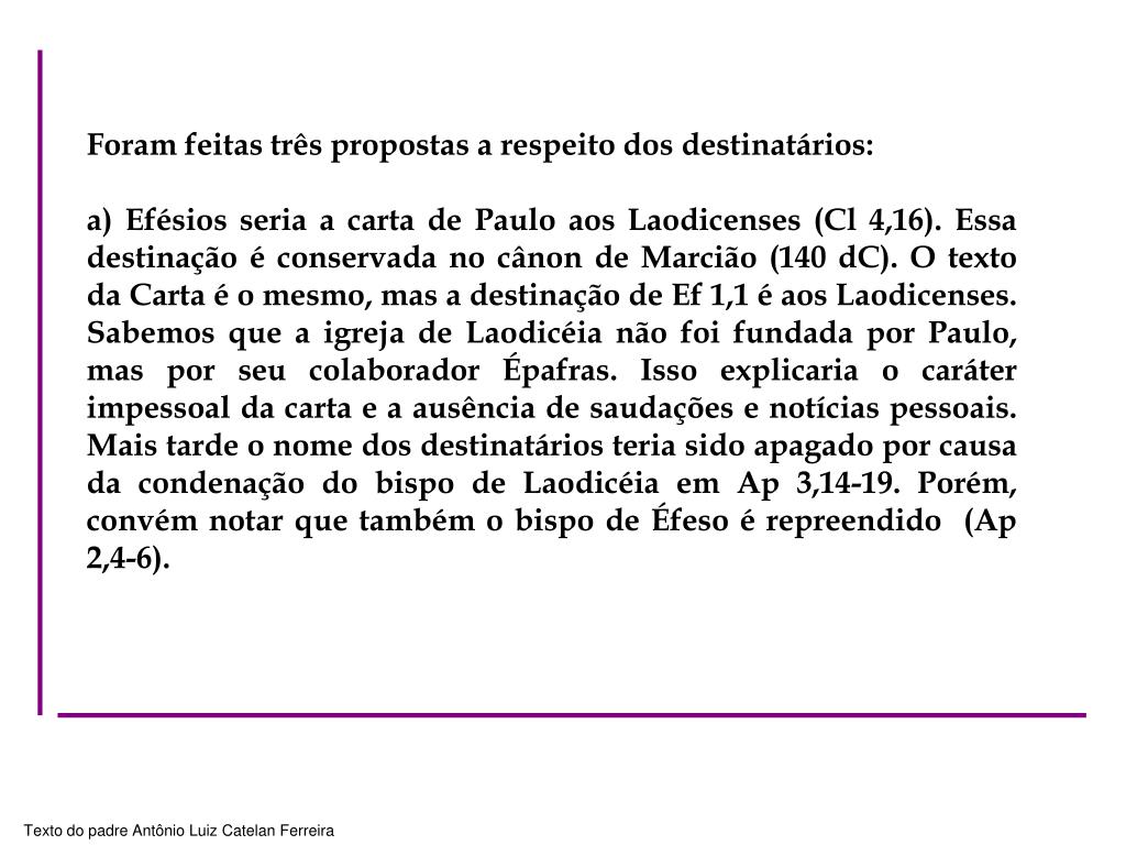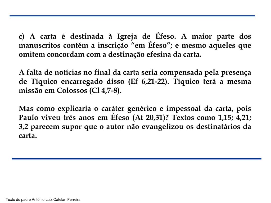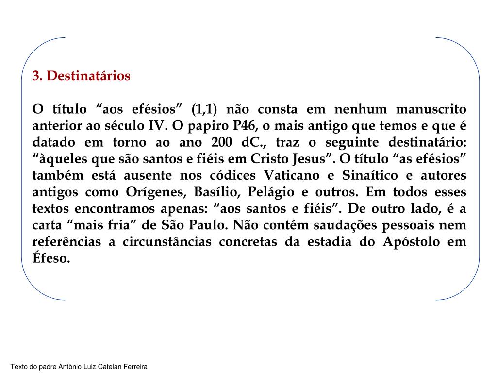 3. Destinatários O título “aos efésios” (1,1) não consta em nenhum manuscrito anterior ao século IV. O papiro P46, o mais antigo que temos e que é datado em torno ao ano 200 dC., traz o seguinte destinatário: “àqueles que são santos e fiéis em Cristo Jesus”. O título “as efésios” também está ausente nos códices Vaticano e Sinaítico e autores antigos como Orígenes, Basílio, Pelágio e outros. Em todos esses textos encontramos apenas: “aos santos e fiéis”. De outro lado, é a carta “mais fria” de São Paulo. Não contém saudações pessoais nem referências a circunstâncias concretas da estadia do Apóstolo em Éfeso.