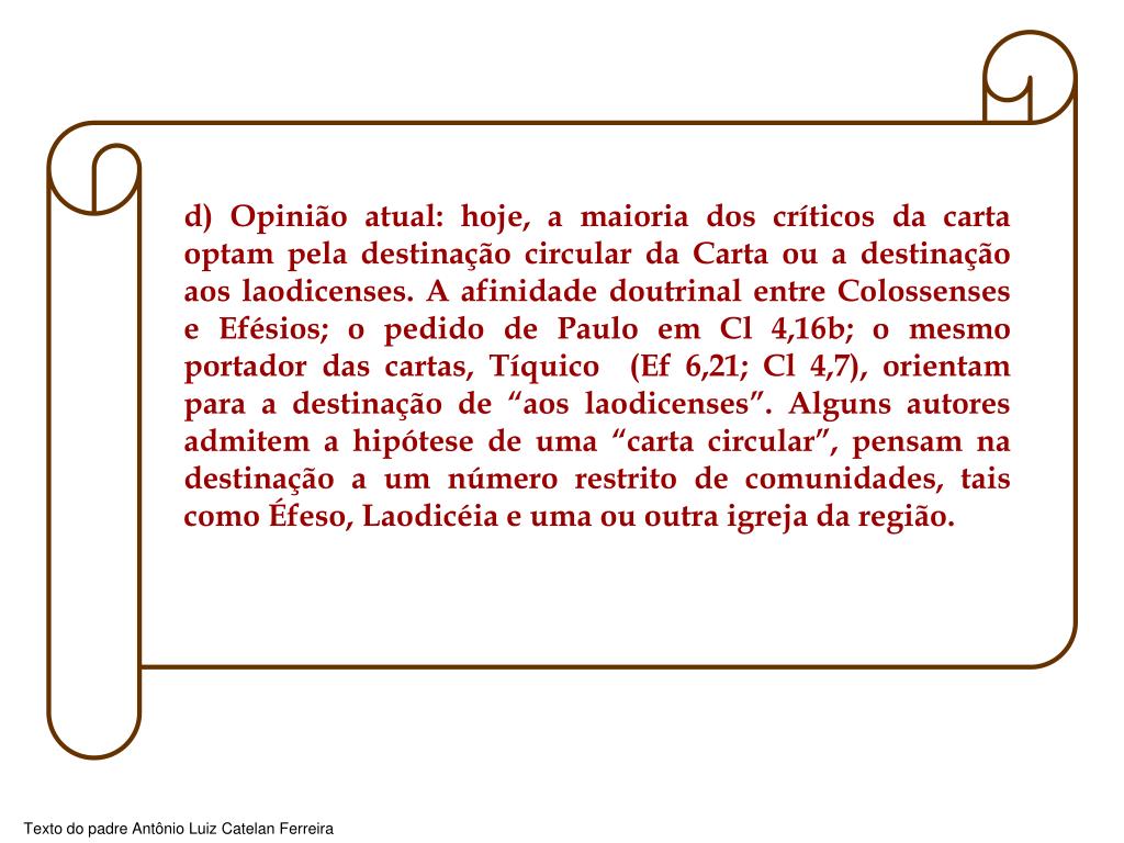 d) Opinião atual: hoje, a maioria dos críticos da carta optam pela destinação circular da Carta ou a destinação aos laodicenses. A afinidade doutrinal entre Colossenses e Efésios; o pedido de Paulo em Cl 4,16b; o mesmo portador das cartas, Tíquico (Ef 6,21;Cl 4,7), orientam para a destinação de “aos laodicenses”. Alguns autores admitem a hipótese de uma “carta circular”, pensam na destinação a um número restrito de comunidades, tais como Éfeso, Laodicéia e uma ou outra igreja da região.