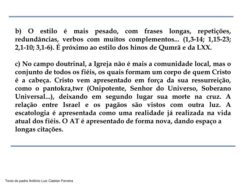 b) O estilo é mais pesado, com frases longas, repetições, redundâncias, verbos com muitos complementos... (1,3-14; 1,15-23; 2,1-10; 3,1-6). É próximo ao estilo dos hinos de Qumrã e da LXX. c) No campo doutrinal, a Igreja não é mais a comunidade local, mas o conjunto de todos os fiéis, os quais formam um corpo de quem Cristo é a cabeça. Cristo vem apresentado em força da sua ressurreição, como o pantokra,twr (Onipotente, Senhor do Universo, Soberano Universal...), deixando em segundo lugar sua morte na cruz. A relação entre Israel e os pagãos são vistos com outra luz. A escatologia é apresentada como uma realidade já realizada na vida atual dos fiéis. O AT é apresentado de forma nova, dando espaço a longas citações.