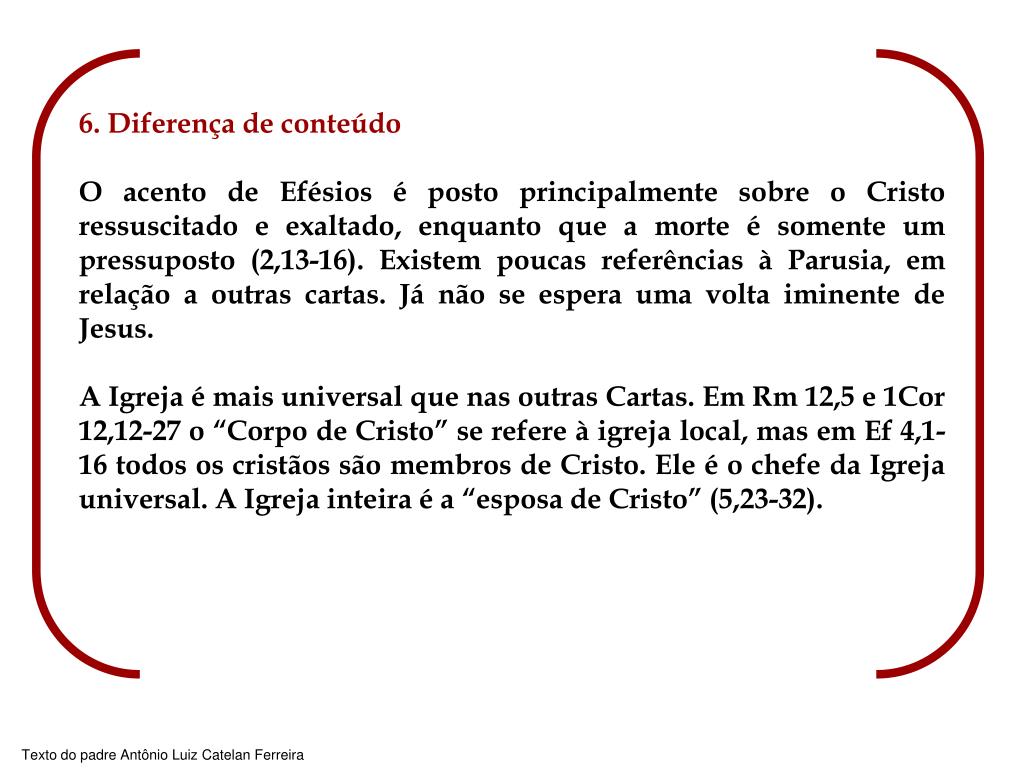 6. Diferença de conteúdo O acento de Efésios é posto principalmente sobre o Cristo ressuscitado e exaltado, enquanto que a morte é somente um pressuposto (2,13-16). Existem poucas referências à Parusia, em relação a outras cartas. Já não se espera uma volta iminente de Jesus. A Igreja é mais universal que nas outras Cartas. Em Rm 12,5 e 1Cor 12,12-27 o “Corpo de Cristo” se refere à igreja local, mas em Ef 4,1-16 todos os cristãos são membros de Cristo. Ele é o chefe da Igreja universal. A Igreja inteira é a “esposa de Cristo” (5,23-32).