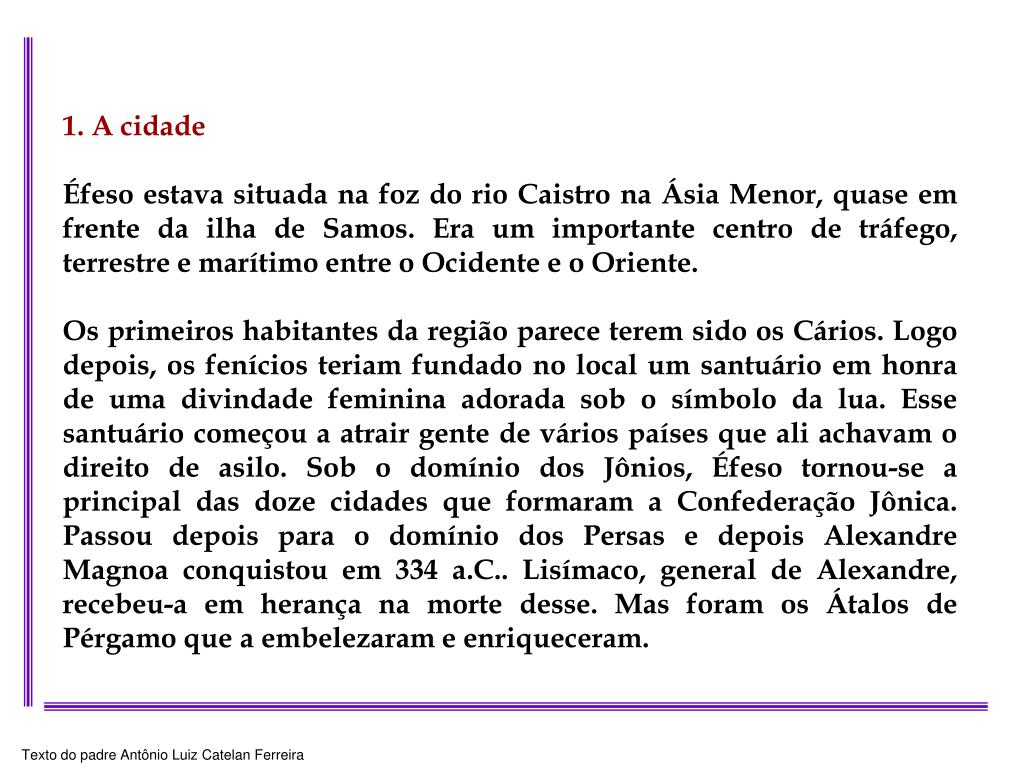 1. A cidade Éfeso estava situada na foz do rio Caistro na Ásia Menor, quase em frente da ilha de Samos. Era um importante centro de tráfego, terrestre e marítimo entre o Ocidente e o Oriente. Os primeiros habitantes da região parece terem sido os Cários. Logo depois, os fenícios teriam fundado no local um santuário em honra de uma divindade feminina adorada sob o símbolo da lua. Esse santuário começou a atrair gente de vários países que ali achavam o direito de asilo. Sob o domínio dos Jônios, Éfeso tornou-se a principal das doze cidades que formaram a Confederação Jônica. Passou depois para o domínio dos Persas e depois Alexandre Magnoa conquistou em 334 a.C.. Lisímaco, general de Alexandre, recebeu-a em herança na morte desse. Mas foram os Átalos de Pérgamo que a embelezaram e enriqueceram.