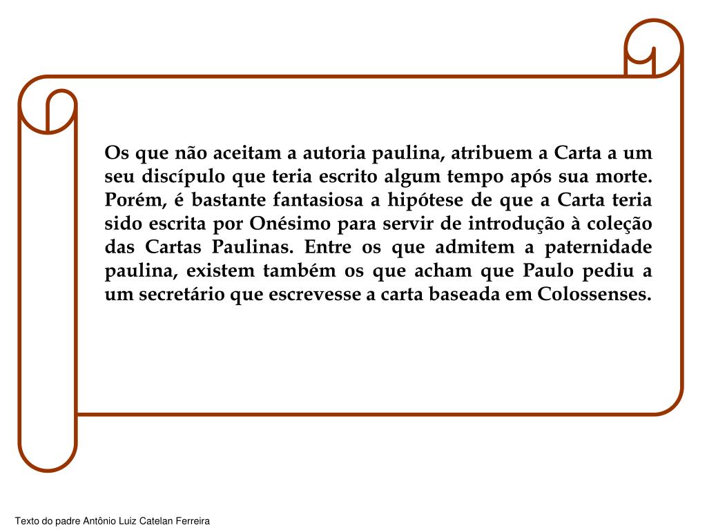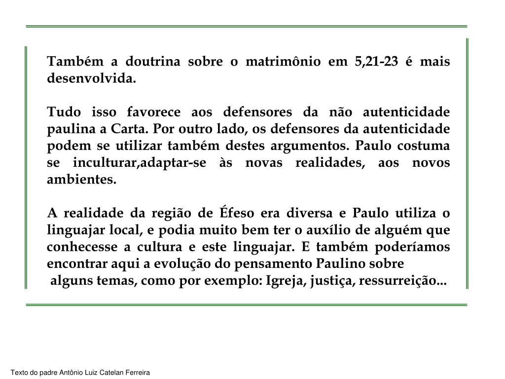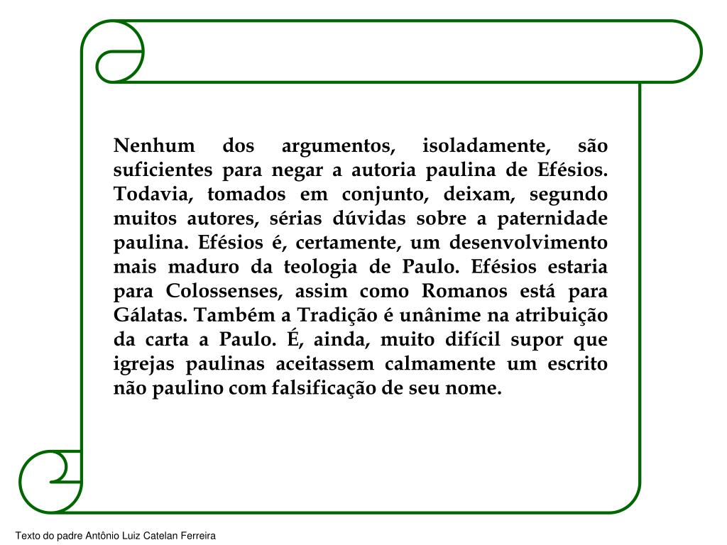 4. Autenticidade paulina Na antigüidade, a paternidade paulina de Efésios foi aceita unanimemente. O próprio texto se refere a Paulo várias vezes (1,1; 3,1; 4,1), além da menção de Tíquico, conhecido colaborador de Paulo. Também essa Carta é colocada entre os escritos paulinos nos cânones mais antigos da Igreja, inclusive no cânone de Marcião, embora com o título “aos laodicenses”. Entretanto no final do século XVIII a autenticidade paulina foi colocada em dúvida pelos motivos seguintes: Diferenças na língua e no estilo: Em Efésios encontramos cerca de 50 vocábulos que não são encontrados nos demais escritos paulinos (exceto as cartas pastorais); cerca de 40 vocábulos não aparecem em outros textos do NT, muitos destes se encontram na LXX e nos escritos dos Santos Padres. Alguns vocábulos presentes nos escritos autênticos de Paulo, aparecem aqui com significado diverso, como: Igreja, mistério, plenitude... Por outro lado, faltam alguns termos tipicamente paulinos, como: irmãos, justo, justificar... O termo justiça, mesmo presente, é utilizado para indicar uma virtude moral.