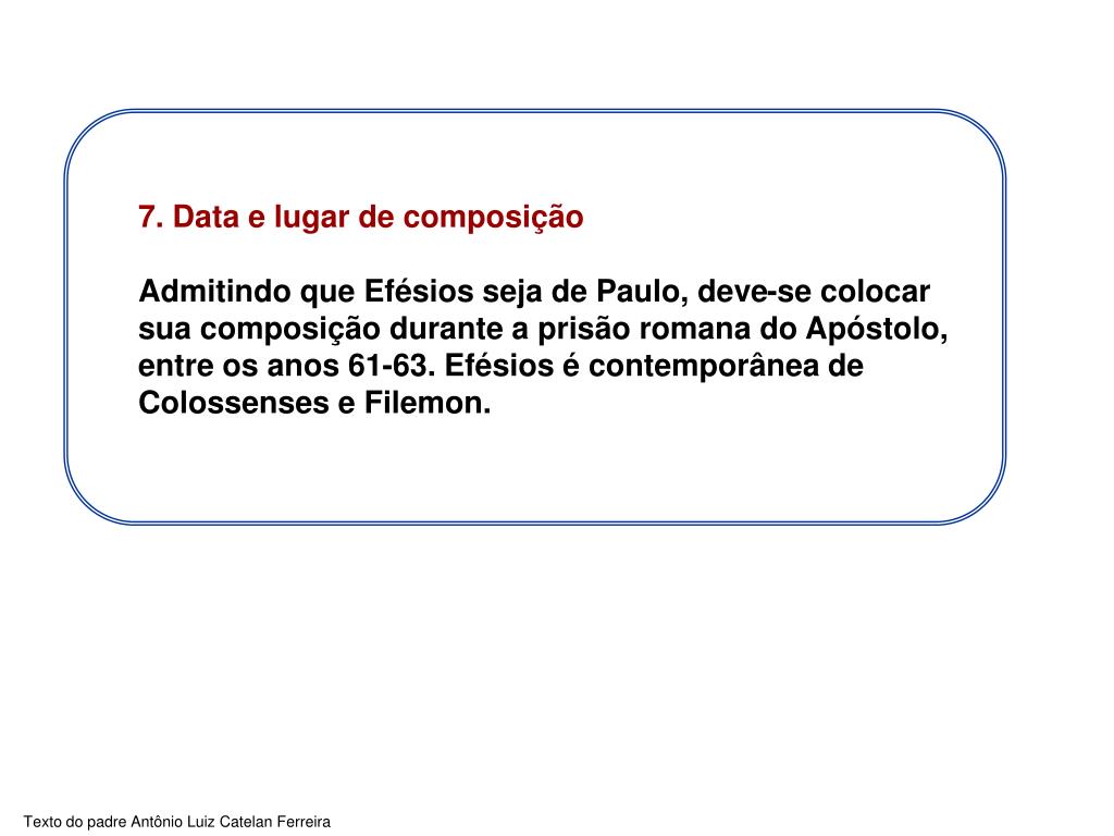 7. Data e lugar de composição Admitindo que Efésios seja de Paulo, deve-se colocar sua composição durante a prisão romana do Apóstolo, entre os anos 61-63. Efésios é contemporânea de Colossenses e Filemon.