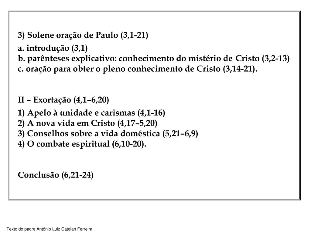 3) Solene oração de Paulo (3,1-21) a. introdução (3,1) b. parênteses explicativo: conhecimento do mistério de Cristo (3,2-13) c. oração para obter o pleno conhecimento de Cristo (3,14-21). II – Exortação (4,1–6,20) 1) Apelo à unidade e carismas (4,1-16) 2) A nova vida em Cristo (4,17–5,20) 3) Conselhos sobre a vida doméstica (5,21–6,9) 4) O combate espiritual (6,10-20). Conclusão (6,21-24)
