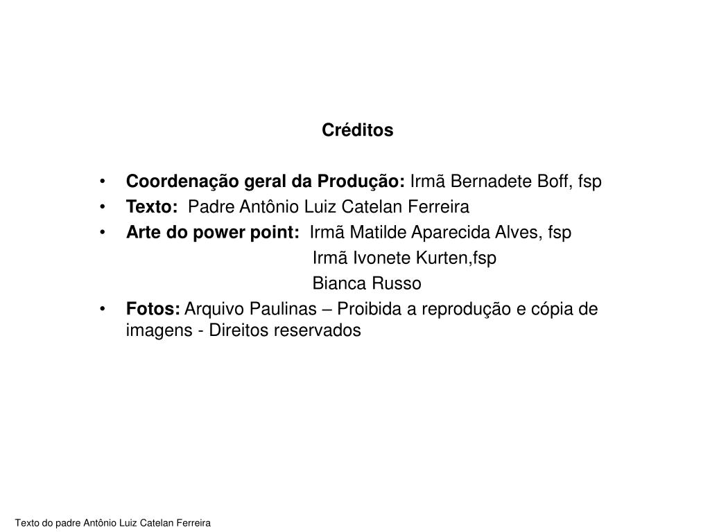 Créditos • Coordenação geral da Produção: Irmã Bernadete Boff, fsp • Texto: Padre Antônio Luiz Catelan Ferreira • Arte do power point: Irmã Matilde Aparecida Alves, fsp Irmã Ivonete Kurten,fsp Bianca Russo • Fotos: Arquivo Paulinas – Proibida a reprodução e cópia de imagens - Direitos reservados