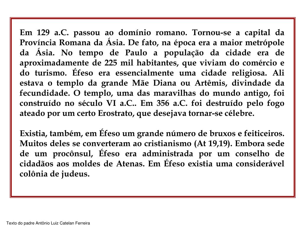 Em 129 a.C. passou ao domínio romano. Tornou-se a capital da Província Romana da Ásia. De fato, na época era a maior metrópole da Ásia. No tempo de Paulo a população da cidade era de aproximadamente de 225 mil habitantes, que viviam do comércio e do turismo. Éfeso era essencialmente uma cidade religiosa. Ali estava o templo da grande Mãe Diana ou Artêmis, divindade da fecundidade. O templo, uma das maravilhas do mundo antigo, foi construído no século VI a.C.. Em 356 a.C. foi destruído pelo fogo ateado por um certo Erostrato, que desejava tornar-se célebre. Existia, também, em Éfeso um grande número de bruxos e feiticeiros. Muitos deles se converteram ao cristianismo (At 19,19). Embora sede de um procônsul, Éfeso era administrada por um conselho de cidadãos aos moldes de Atenas. Em Éfeso existia uma considerável colônia de judeus.