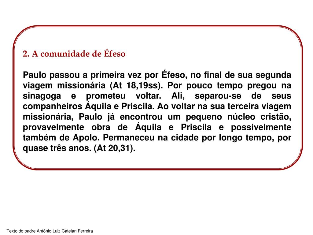 2. A comunidade de Éfeso Paulo passou a primeira vez por Éfeso, no final de sua segunda viagem missionária (At 18,19ss). Por pouco tempo pregou na sinagoga e prometeu voltar. Ali, separou-se de seus companheiros Áquila e Priscila. Ao voltar na sua terceira viagem missionária, Paulo já encontrou um pequeno núcleo cristão, provavelmente obra de Áquila e Priscila e possivelmente também de Apolo. Permaneceu na cidade por longo tempo, por quase três anos. (At 20,31).