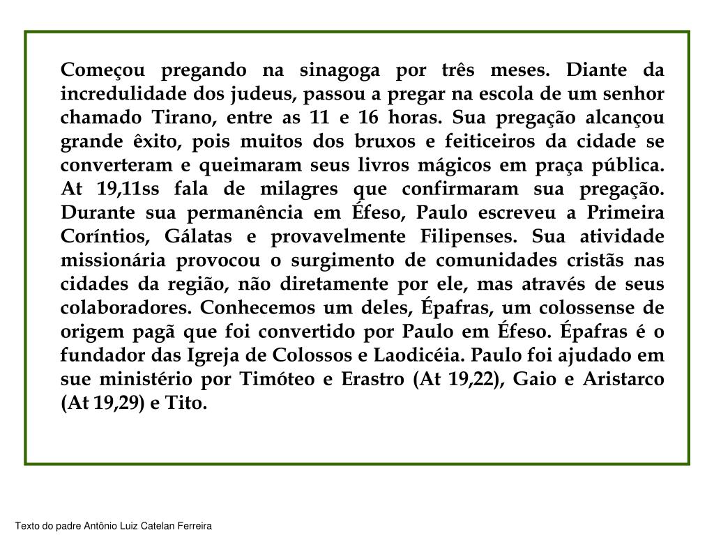 Começou pregando na sinagoga por três meses. Diante da incredulidade dos judeus, passou a pregar na escola de um senhor chamado Tirano, entre as 11 e 16 horas. Sua pregação alcançou grande êxito, pois muitos dos bruxos e feiticeiros da cidade se converteram e queimaram seus livros mágicos em praça pública. At 19,11ss fala de milagres que confirmaram sua pregação. Durante sua permanência em Éfeso, Paulo escreveu a Primeira Coríntios, Gálatas e provavelmente Filipenses. Sua atividade missionária provocou o surgimento de comunidades cristãs nas cidades da região, não diretamente por ele, mas através de seus colaboradores. Conhecemos um deles, Épafras, um colossense de origem pagã que foi convertido por Paulo em Éfeso. Épafras é o fundador das Igreja de Colossos e Laodicéia. Paulo foi ajudado em sue ministério por Timóteo e Erastro (At 19,22), Gaio e Aristarco (At 19,29) e Tito.