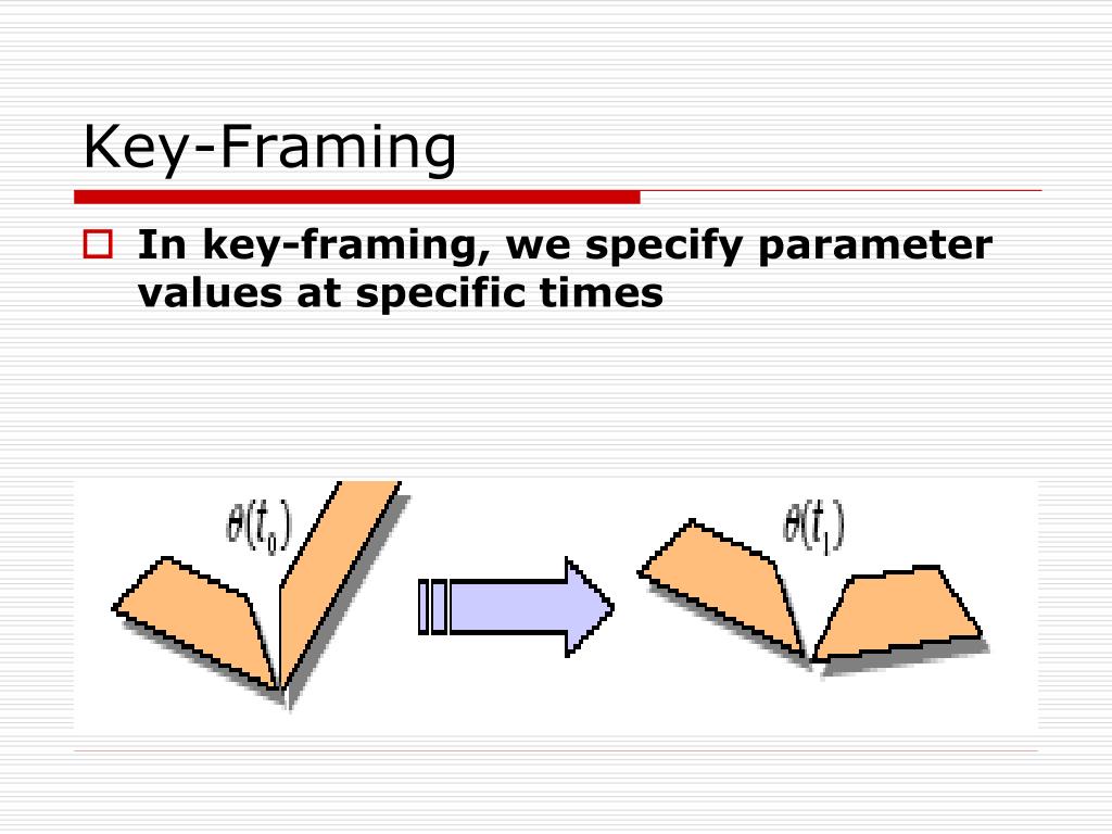 Key-Framing • In key-framing, we specify parameter values at specific times