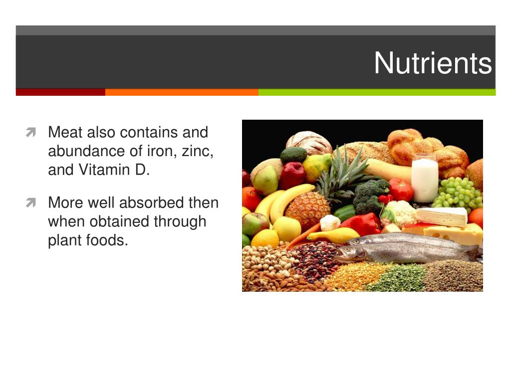 Nutrients • Meat also contains and abundance of iron, zinc, and Vitamin D. • More well absorbed then when obtained through plant foods.