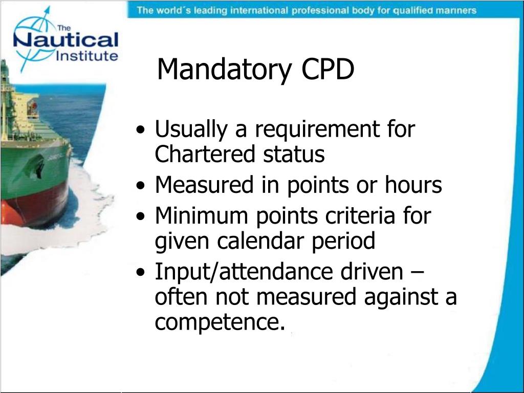 CPD Definition • “The Nautical Institute defines Continuing Professional Development (CPD) as the systematic maintenance, improvement and broadening of knowledge and skills, and the development of personal qualities necessary for execution of professional and technical duties throughout the individual's working life, at sea and ashore”. • (adapted from Todd, summarised in Friedman and Woodhead 2008: p. 95, as amended Haughton).