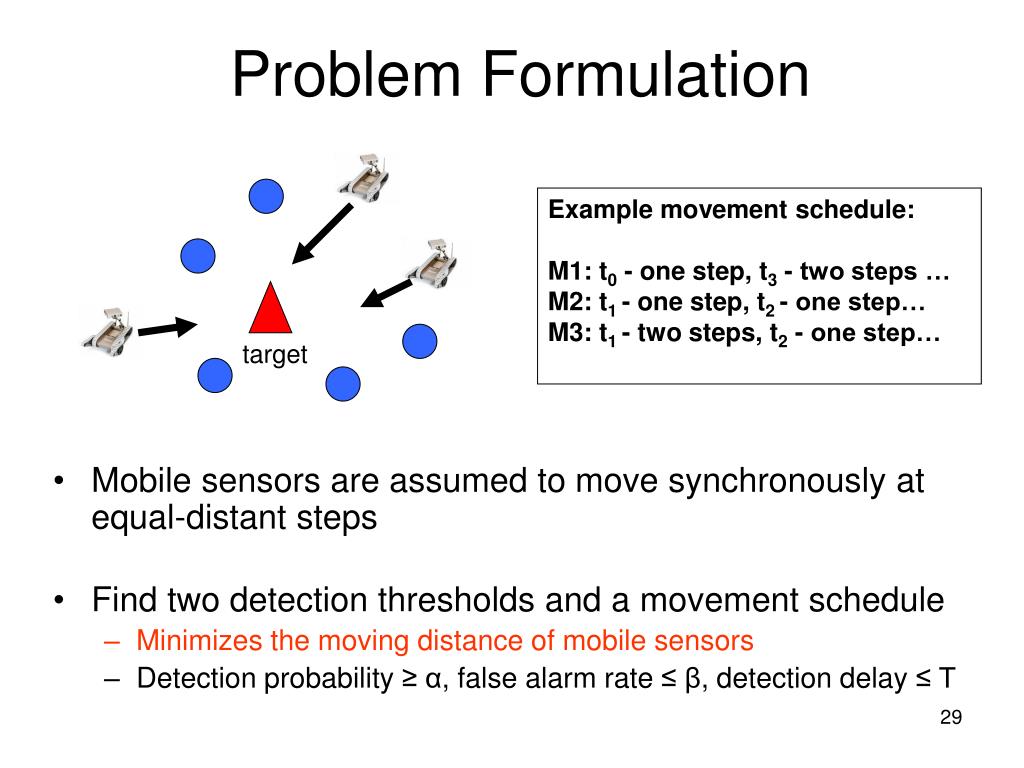 Problem Formulation • Mobile sensors are assumed to move synchronously at equal-distant steps • Find two detection thresholds and a movement schedule • Minimizes the moving distance of mobile sensors • Detection probability ≥ α, false alarm rate ≤β, detection delay ≤ T Example movement schedule: M1: t0 - one step, t3 - two steps … M2: t1 -one step, t2 -one step… M3: t1 -two steps, t2 -one step… target