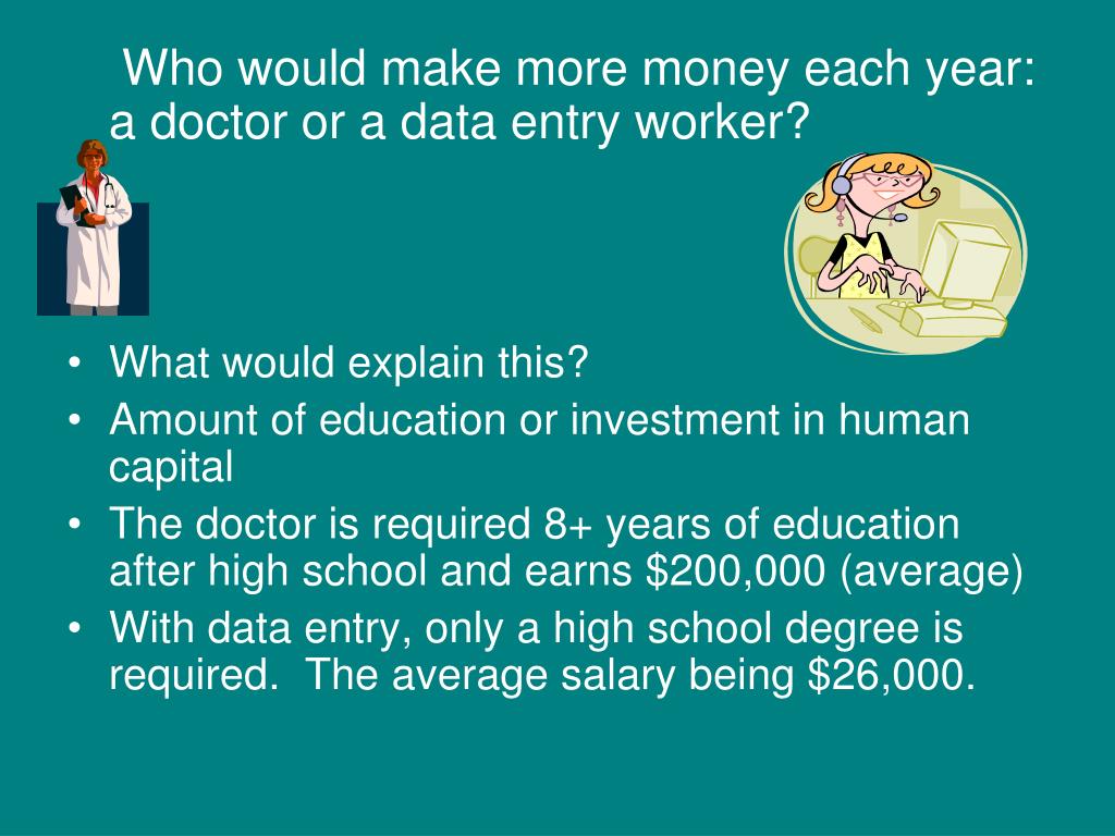 Who would make more money each year: a doctor or a data entry worker? • What would explain this? • Amount of education or investment in human capital • The doctor is required 8+ years of education after high school and earns $200,000 (average) • With data entry, only a high school degree is required. The average salary being $26,000.