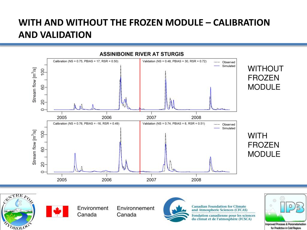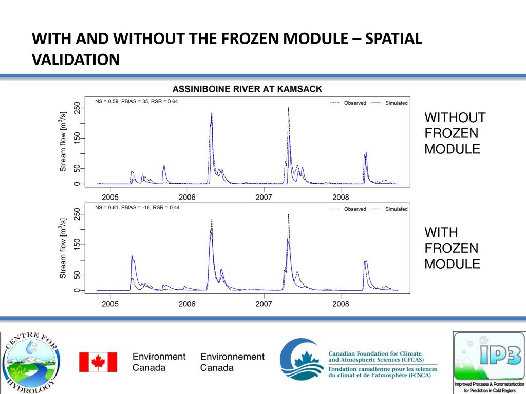 Conclusions Small scale process studies were successfully used in a bottom-up approach to assist in calibrating and segmenting the basin in a large-scale “top-down” type of modeling system. Landscape-based parameters used in vertical water budget estimates that were calibrated in one basin have some validity when used in other basins. At the large-scale, the GRU approach allows for consistent landscapes parameterization provided we have sufficient information for validation in space and time. Large Scale modeling of the Saskatchewan and Assiniboine River systems were successful using a landscape based approach with MESH. Further refinements to the model ( parameterization and some aspect of physics) particularly dealing with basin segmentation and grid size still needs to be considered. MESH and CHRM form a complimentary modeling platform that allow for rigorous testing from the bottom-up and the top down. With the Sask River basin and the upper Assiniboine testing completed, we are in the enviable position of looking at scale effects on hydrological modeling while quantifying to some degree the importance or need for calibration and important scale dependencies for physical processes and parameterizations. Because we are running coupled system with the atmosphere, the sensitivity and importance of parameterization for closing water budget ( comparing to hydrographs) should impact in a positive way our ability to predict short-term weather and also improve our ability to engage in improved regional climate modeling.