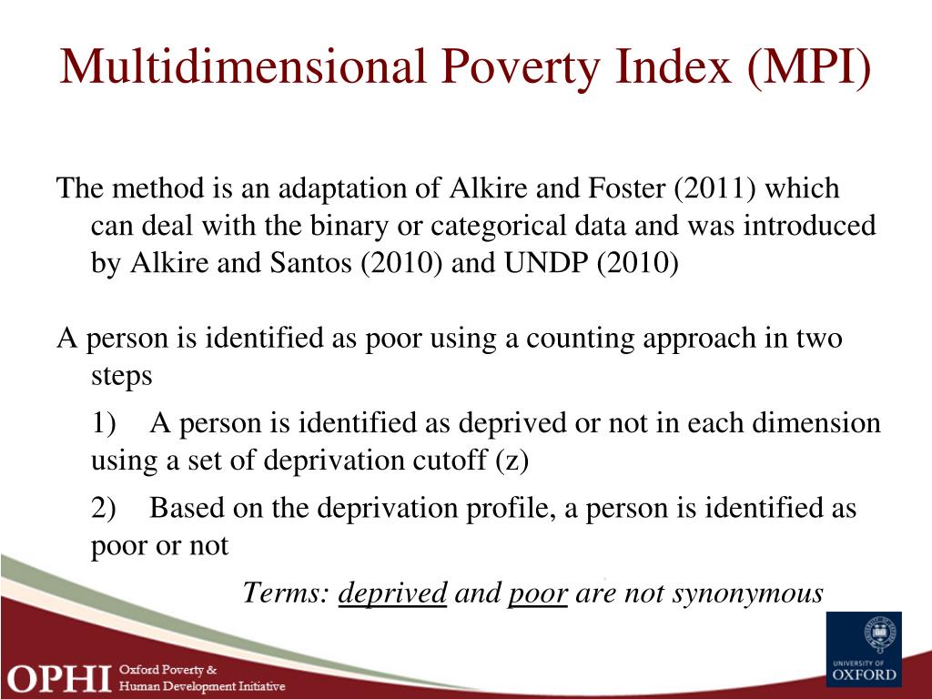 Multidimensional Poverty Index (MPI) The method is an adaptation of Alkire and Foster (2011) which can deal with the binary or categorical data and was introduced by Alkire and Santos (2010) and UNDP (2010) A person is identified as poor using a counting approach in two steps 1) A person is identified as deprived or not in each dimension using a set of deprivation cutoff (z) 2) Based on the deprivation profile, a person is identified as poor or not Terms: deprived and poor are not synonymous