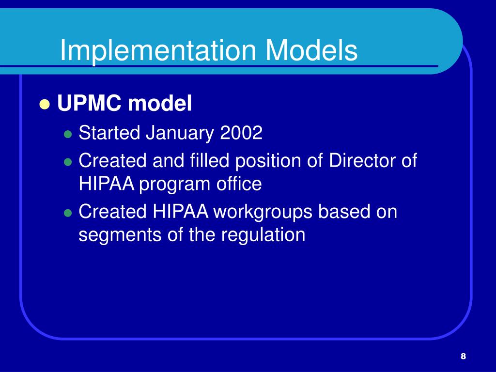Implementation Models • UPMC model • Started January 2002 • Created and filled position of Director of HIPAA program office • Created HIPAA workgroups based on segments of the regulation