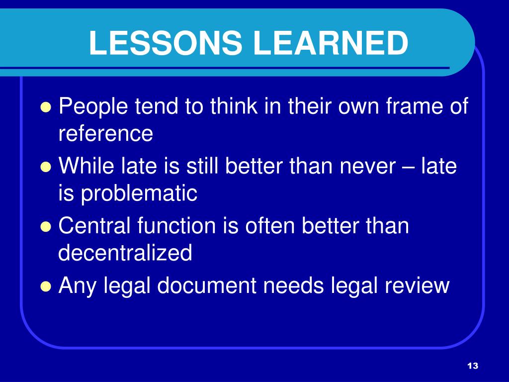LESSONS LEARNED • People tend to think in their own frame of reference • While late is still better than never – late is problematic • Central function is often better than decentralized • Any legal document needs legal review
