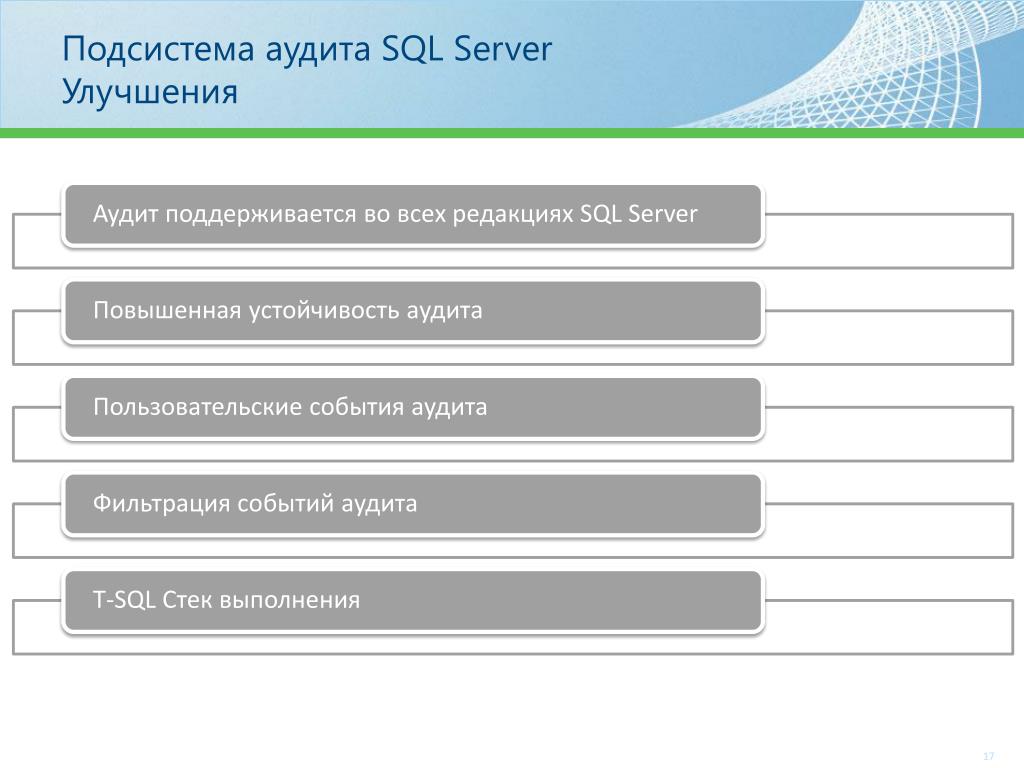 Улучшение устойчивости Select… Rollback • Было: • В случаи сбоя записи событий аудита они могли потеряться • ИспользовалосьON_FAILURE = SHUTDOWN • Теперь: • Автоматическое восстановление при большинстве сбоев • Добавлено“ON_FAILURE = FAIL_OPERATION” • Добавлено“MAX_FILES” option
