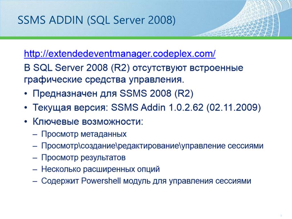 Аудит поддерживается во всех редакциях • Основные возможности аудита • Аудит сервера • Аудит БД только в Enterprise • Больше не нуженSQLTrace (!) • В будущих версиях будет удалён • Основные преимущества аудита • Производительность • Несколько аудитов для нескольких целей • Управляемость и изоляция • Несколько сценариев реагирования на сбой аудита