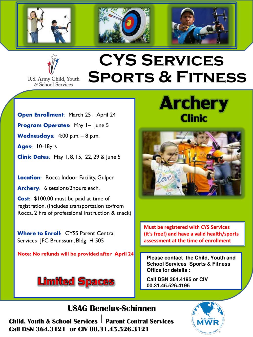 CYS Services. Sports & Fitness. Archery. Clinic. Open Enrollment: March 25 – April 24 Program Operates: May 1– June 5 Wednesdays : 4:00 p.m. – 8 p.m. Ages : 10-18yrs Clinic Dates: May 1, 8, 15, 22, 29 & June 5 Location: Rocca Indoor Facility, Gulpen