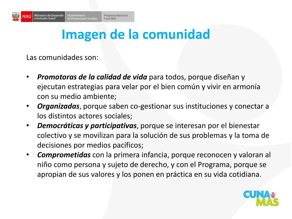 Imagen de la comunidad • Las comunidades son: • Promotoras de la calidad de vidapara todos, porque diseñan y ejecutan estrategias para velar por el bien común y vivir en armonía con su medio ambiente; • Organizadas, porque saben co-gestionar sus instituciones y conectar a los distintos actores sociales; • Democráticas y participativas, porque se interesan por el bienestar colectivo y se movilizan para la solución de sus problemas y la toma de decisiones por medios pacíficos; • Comprometidascon la primera infancia, porque reconocen y valoran al niño como persona y sujeto de derecho, y con el Programa, porque se apropian de sus valores y los ponen en práctica en su vida cotidiana.