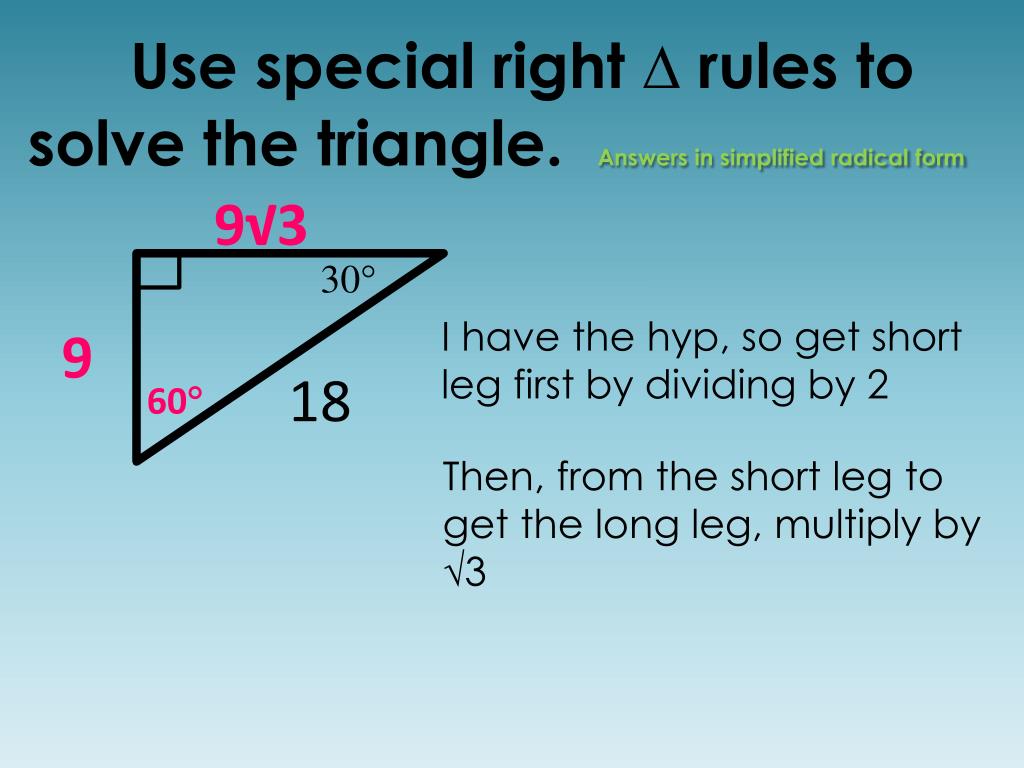 Use special right ∆ rules to solve the triangle. Answers in simplified radical form 9√3 30 I have the hyp, so get short leg first by dividing by 2 9 18 60 Then, from the short leg to get the long leg, multiply by √3