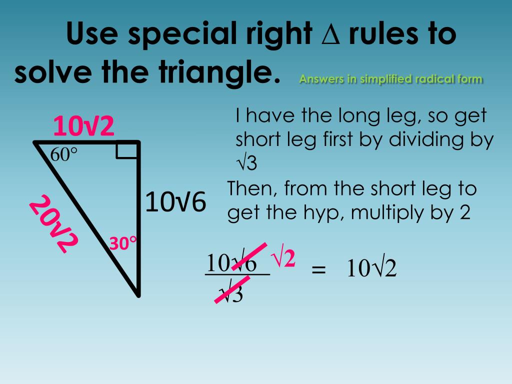 Use special right ∆ rules to solve the triangle. Answers in simplified radical form I have the long leg, so get short leg first by dividing by √3 10√2 60 Then, from the short leg to get the hyp, multiply by 2 10√6 20√2 30 √2 10√6 √3 = 10√2