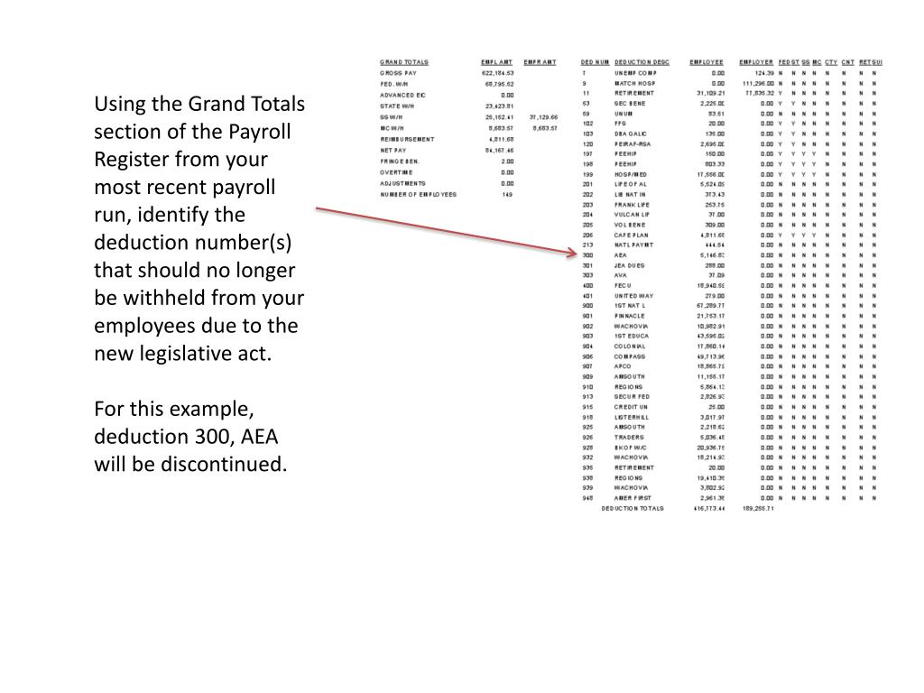 Using the Grand Totals section of the Payroll Register from your most recent payroll run, identify the deduction number(s) that should no longer be withheld from your employees due to the new legislative act. For this example, deduction 300, AEA will be discontinued.