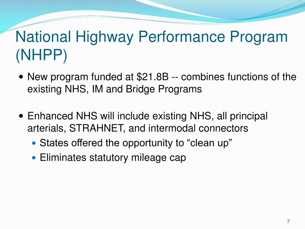 National Highway Performance Program (NHPP) • New program funded at $21.8B -- combines functions of the existing NHS, IM and Bridge Programs • Enhanced NHS will include existing NHS, all principal arterials, STRAHNET, and intermodal connectors • States offered the opportunity to “clean up” • Eliminates statutory mileage cap
