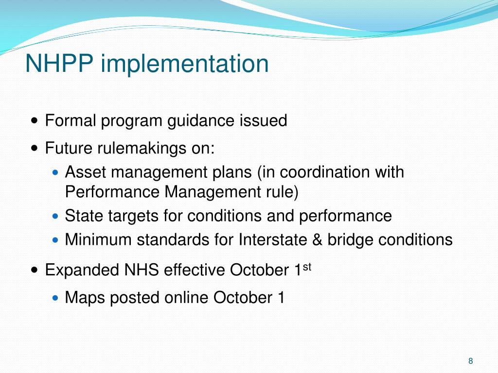 NHPP implementation • Formal program guidance issued • Future rulemakings on: • Asset management plans (in coordination with Performance Management rule) • State targets for conditions and performance • Minimum standards for Interstate & bridge conditions • Expanded NHS effective October 1st • Maps posted online October 1