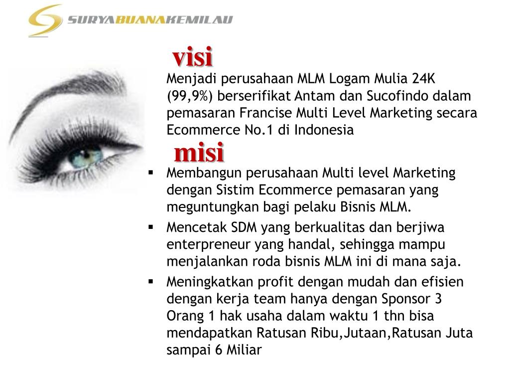 visi misi MenjadiperusahaanMLMLogamMulia 24K (99,9%) berserifikatAntam dan Sucofindodalampemasaran FranciseMulti Level Marketing secara Ecommerce No.1 di Indonesia • Membangunperusahaan Multi level Marketing dengan Sistim Ecommerce pemasaran yang meguntungkan bagi pelaku Bisnis MLM. • Mencetak SDM yang berkualitas dan berjiwa enterpreneur yang handal, sehingga mampu menjalankan roda bisnis MLM ini di mana saja. • Meningkatkan profit dengan mudah dan efisien dengan kerja team hanya dengan Sponsor 3 Orang 1 hak usaha dalam waktu 1 thn bisa mendapatkan Ratusan Ribu,Jutaan,Ratusan Juta sampai 6 Miliar