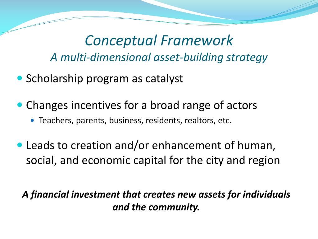 Conceptual FrameworkA multi-dimensional asset-building strategy • Scholarship program as catalyst • Changes incentives for a broad range of actors • Teachers, parents, business, residents, realtors, etc. • Leads to creation and/or enhancement of human, social, and economic capital for the city and region A financial investment that creates new assets for individuals and the community.