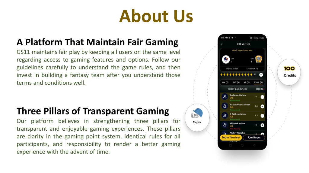 About Us A Platform That Maintain Fair Gaming GS11 maintains fair play by keeping all users on the same level regarding access to gaming features and options. Follow our guidelines carefully to understand the game rules, and then invest in building a fantasy team after you understand those terms and conditions well. Three Pillars of Transparent Gaming Our platform believes in strengthening three pillars for transparent and enjoyable gaming experiences. These pillars are clarity in the gaming point system, identical rules for all participants, and responsibility to render a better gaming experience with the advent of time.