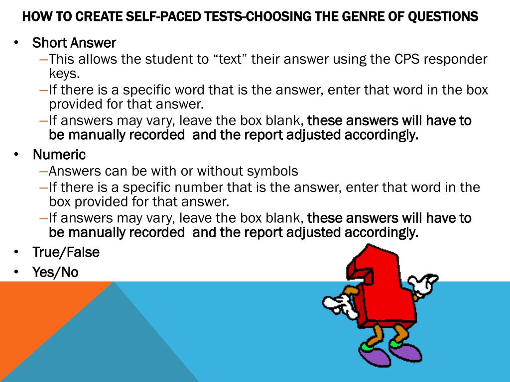 HOW TO CREATE SELF-PACED TESTS-CHOOSING THE GENRE OF QUESTIONS • Short Answer • This allows the student to “text” their answer using the CPS responder keys. • If there is a specific word that is the answer, enter that word in the box provided for that answer. • If answers may vary, leave the box blank, these answers will have to be manually recorded and the report adjusted accordingly. • Numeric • Answers can be with or without symbols • If there is a specific number that is the answer, enter that word in the box provided for that answer. • If answers may vary, leave the box blank, these answers will have to be manually recorded and the report adjusted accordingly. • True/False • Yes/No