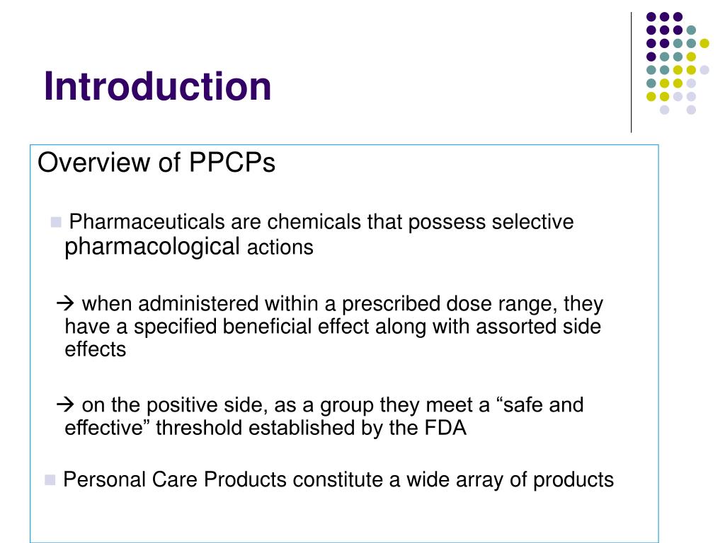 Introduction Overview of PPCPs Pharmaceuticals are chemicals that possess selective pharmacological actions when administered within a prescribed dose range, they have a specified beneficial effect along with assorted side effects on the positive side, as a group they meet a “safe and effective” threshold established by the FDA Personal Care Products constitute a wide array of products