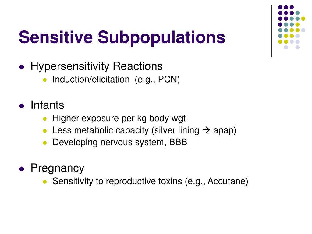 Sensitive Subpopulations • Hypersensitivity Reactions • Induction/elicitation (e.g., PCN) • Infants • Higher exposure per kg body wgt • Less metabolic capacity (silver lining apap) • Developing nervous system, BBB • Pregnancy • Sensitivity to reproductive toxins (e.g., Accutane)