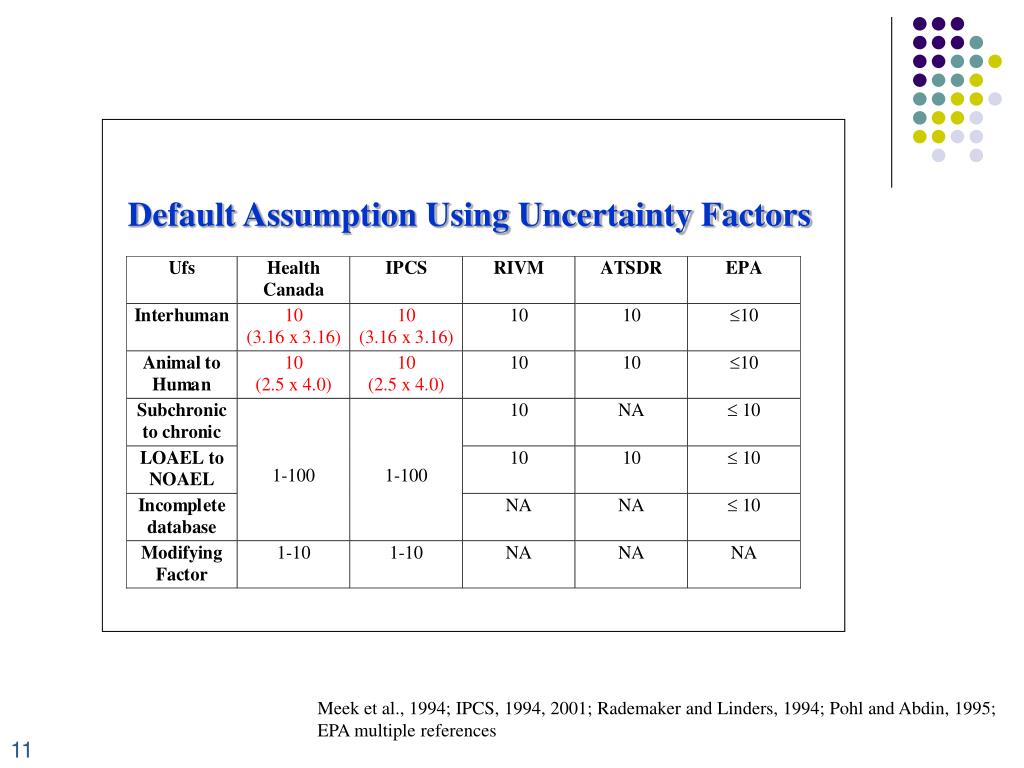 Default Assumption Using Uncertainty Factors M. Dourson Meek et al., 1994; IPCS, 1994, 2001; Rademaker and Linders, 1994; Pohl and Abdin, 1995; EPA multiple references 11