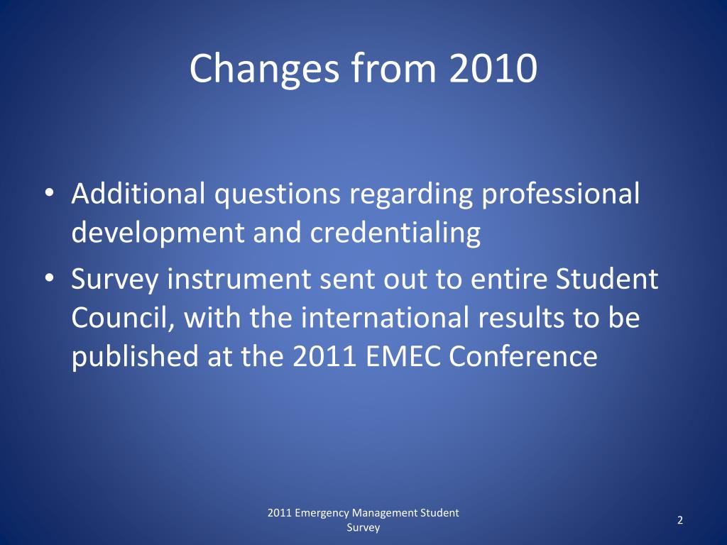 Changes from 2010 • Additional questions regarding professional development and credentialing • Survey instrument sent out to entire Student Council, with the international results to be published at the 2011 EMEC Conference 2011 Emergency Management Student Survey