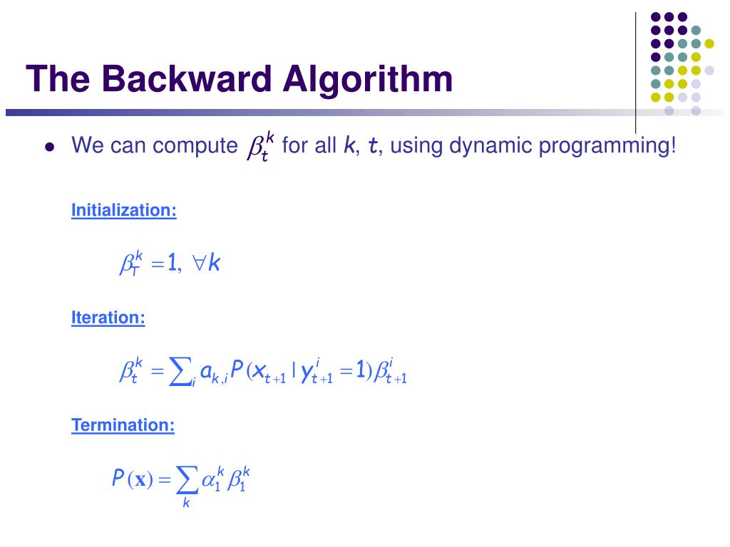 The Backward Algorithm • We can compute for all k, t, using dynamic programming! Initialization: Iteration: Termination:
