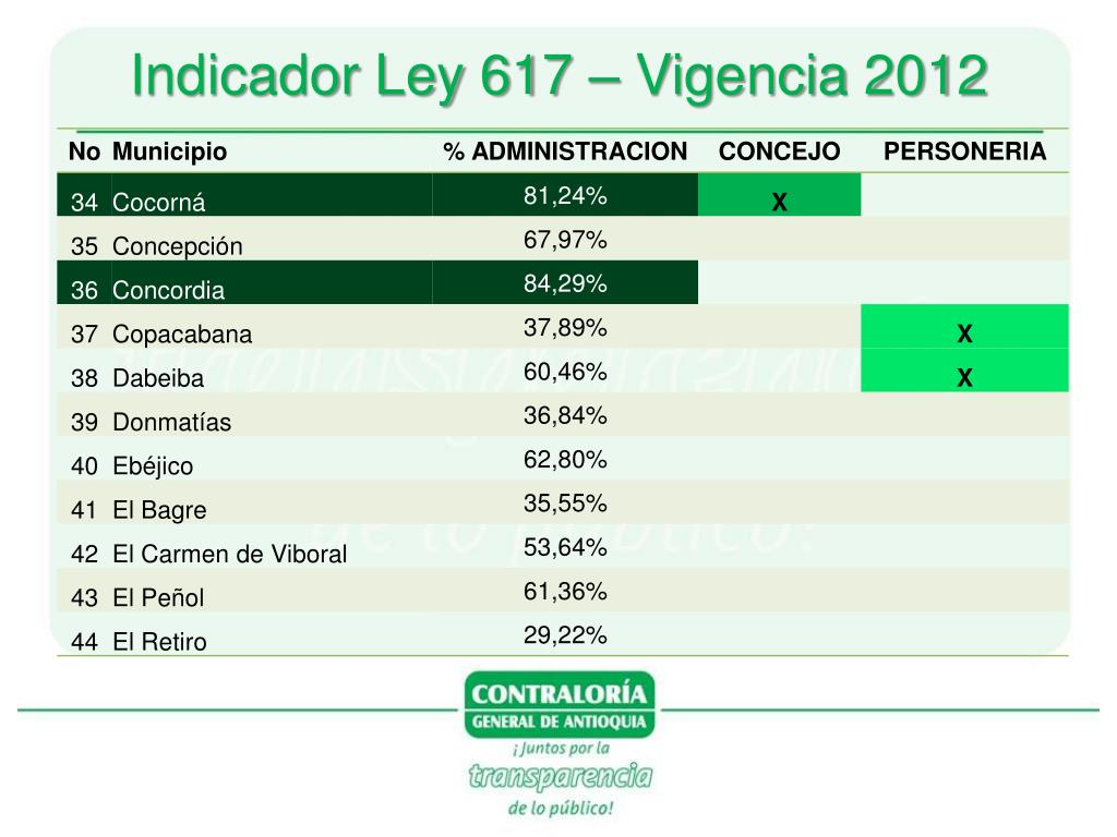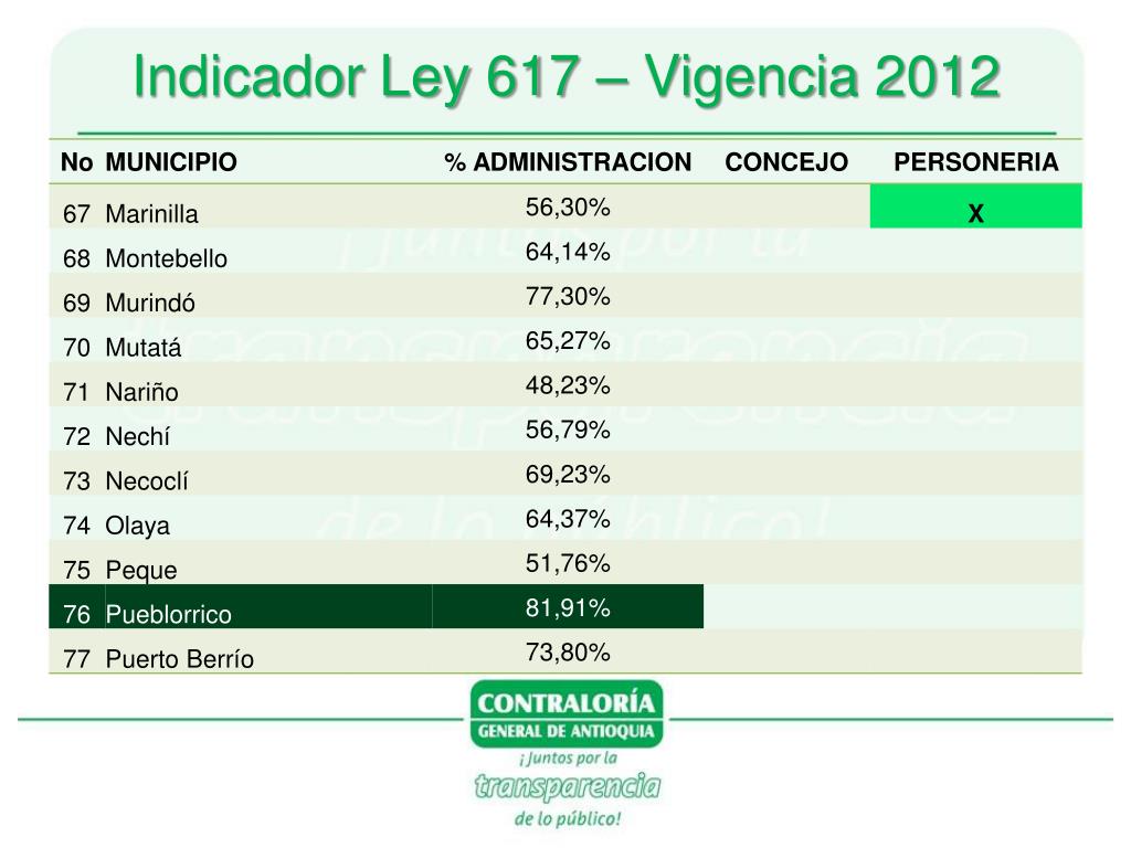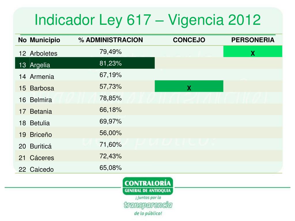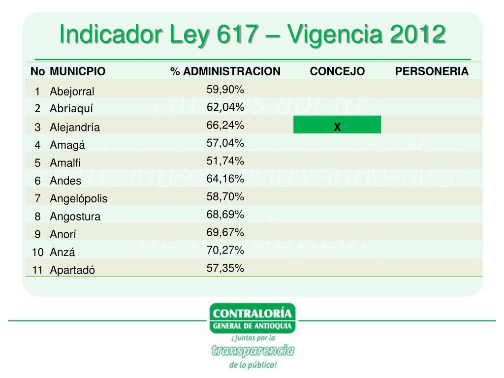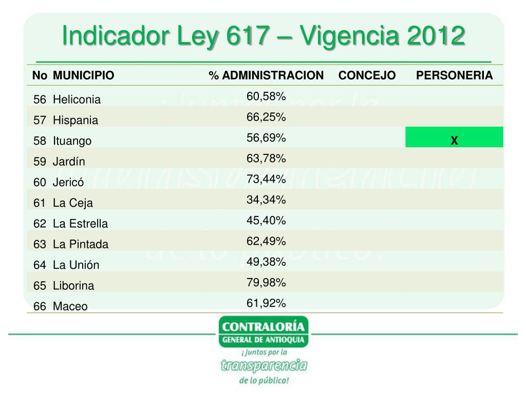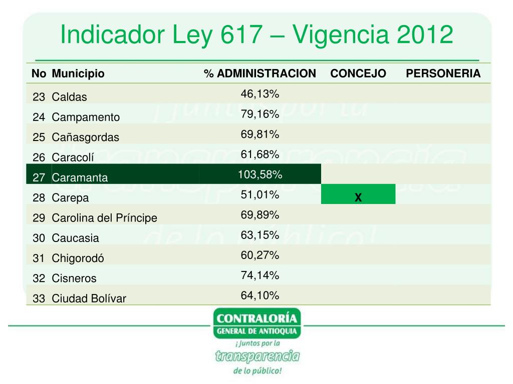 Indicador Ley 617 – Vigencia 2012 Incumplimiento
